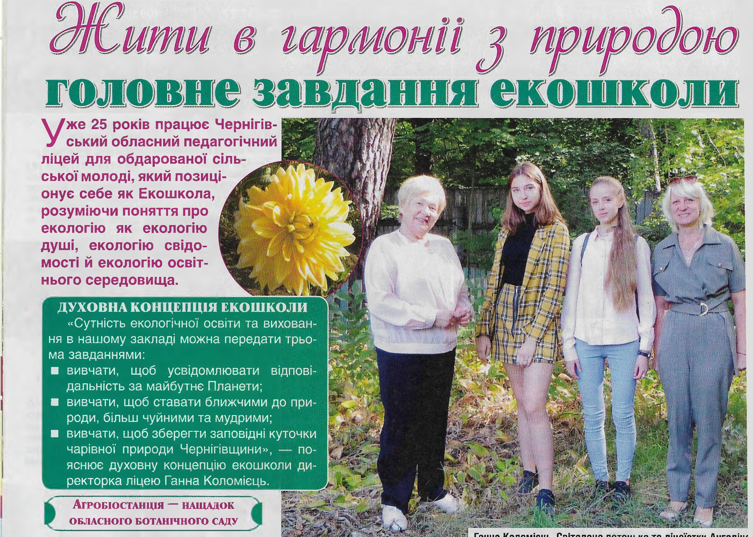 Уже 25 років працює Чернігівський обласний педагогічний ліцей для обдарованої сільської молоді, якмй позиціонує себе як Екошкола, розуміючи поняття про екологію як екологію душі, екологію свідомості й екологію освітнього середовища. |