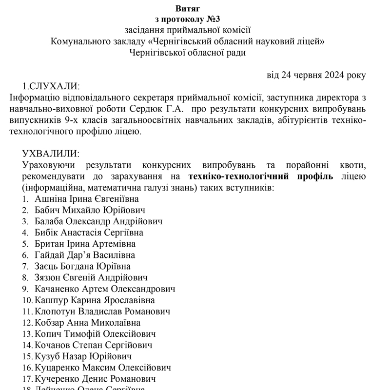 Витяг з протоколу №3 засідання приймальної комісії Комунального закладу «Чернігівський обласний науковий ліцей» Чернігівської обласної ради від 24 червня 2024 року