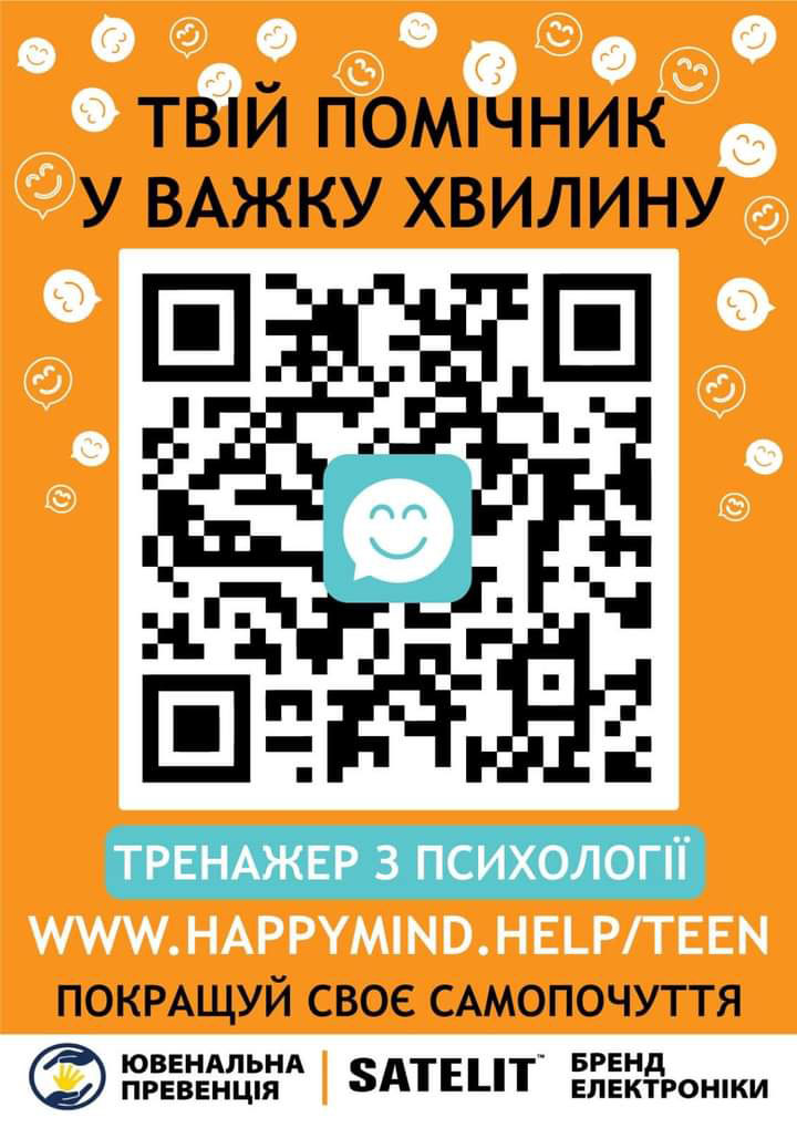 Запрошуємо ознайомитися з онлайн тренажером з психології «HappyMind.Help» (розроблений спеціально для використання в закладах загальної середньої освіти дітьми та підлітками), електронний QR-код з посиланням на онлайн тренажер: [https://happymind.help/teen]( https://happymind.help/teen).