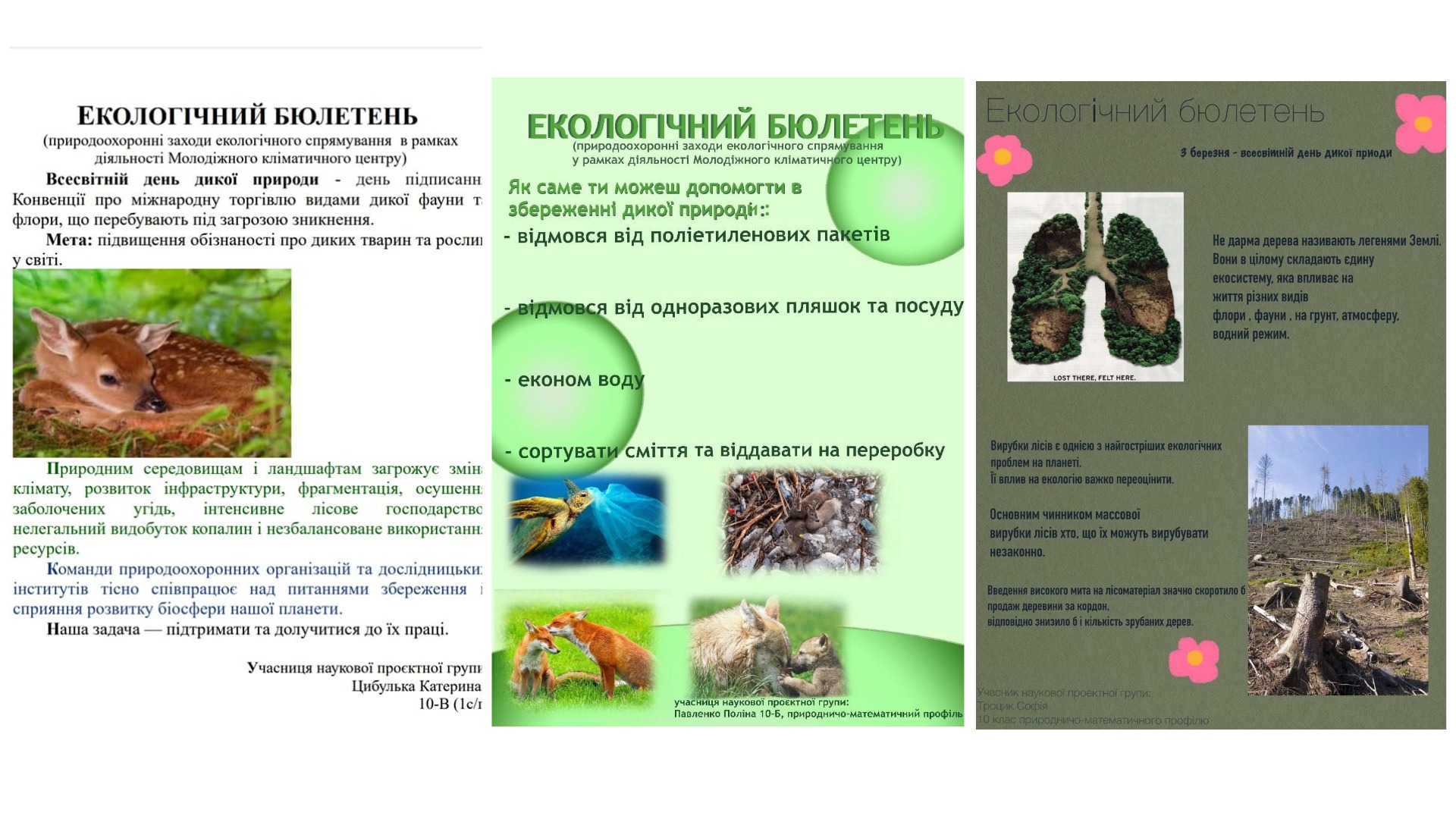 екологічні бюлетені щодо актуальності дати, основних форм роботи щодо захисту дикої природи та взаємодії різних організацій у цій галузі.