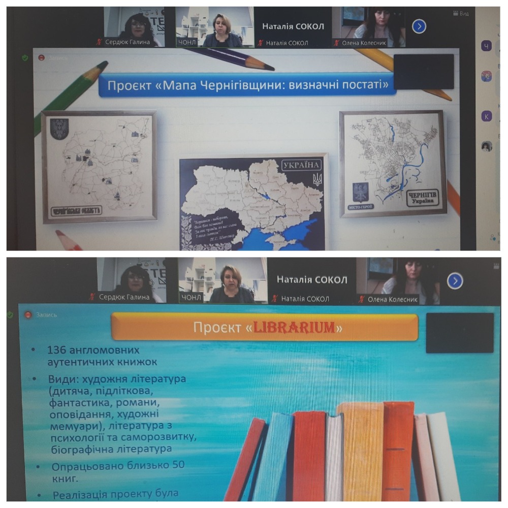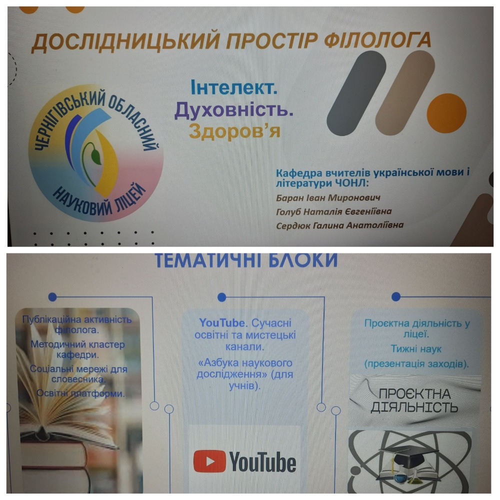 Спільними зусиллями кафедри філологічних дисциплін та методики їх викладання ЧОІППО імені К. Ушинського та КЗ «Чернігівський обласний науковий ліцей» Чернігівської обласної ради вдалося об’єднати вчителів української мови і літератури. Сутність спеціалізованої освіти наукового спрямування, дослідницька компетентність учителя-філолога та її компоненти, педагогічні умови розвитку, обговорення сучасних практик організації дослідництва та джерел професійного розвитку, дорожня карта вчителя-дослідника – предмет фахового спілкування педагогів наукового ліцею (Баран І.М., Голуб Н.Є, Сердюк Г.А.) з учителями-словесниками Чернігівщини, Полтавщини, Тернопільщини (114 учасників).