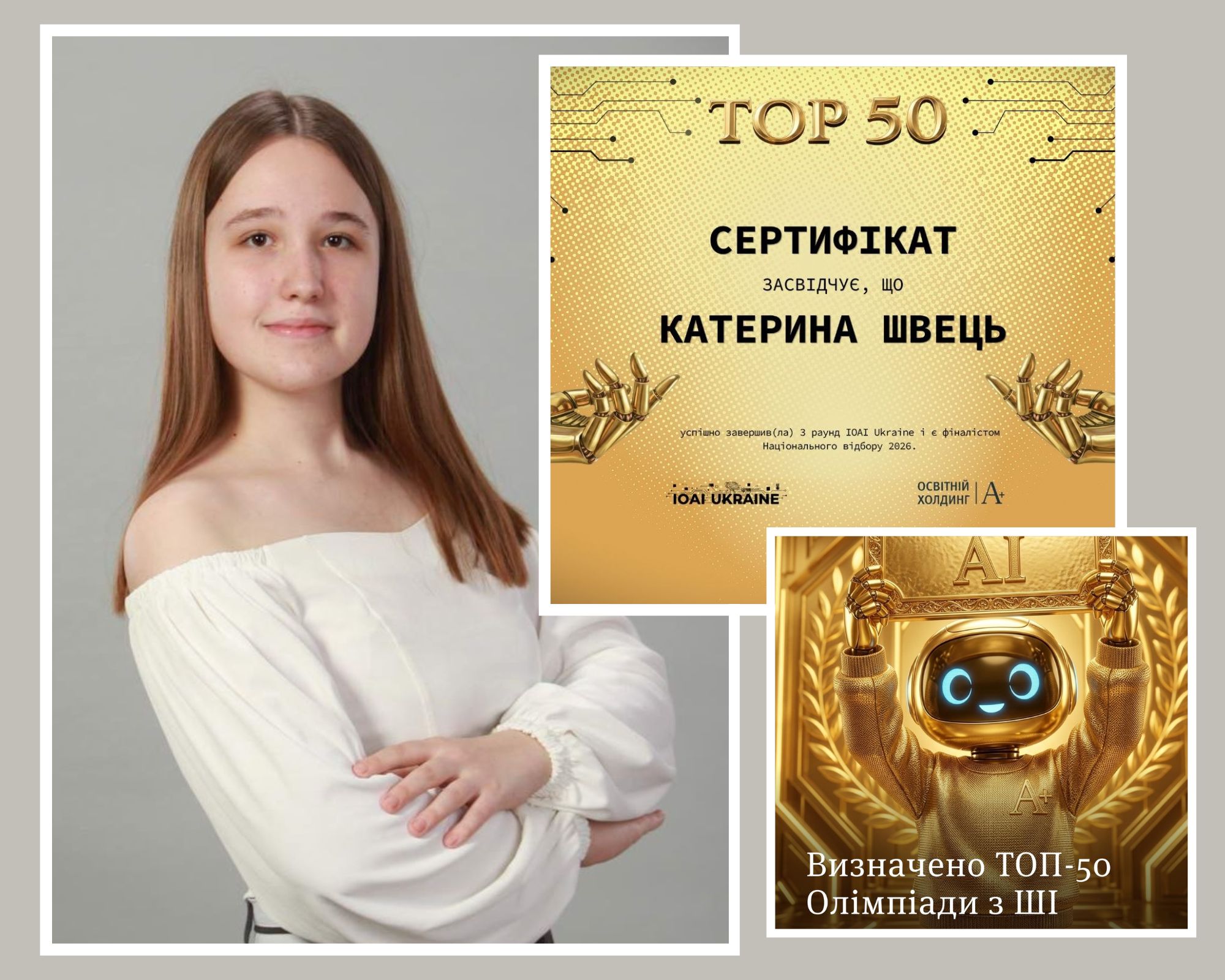 Катерина Швець, учениця суспільного-гуманітарного профілю (економіко-правова галузь знань) стала однією з топ-50 учасників з усієї України, які показали найкращий результат у третьому турі національного відбору міжнародної олімпіади зі штучного інтелекту та проходить у фінал.Саме серед них сформують національну збірну України, що представлятиме країну на Міжнародній олімпіаді зі штучного інтелекту IOAI.