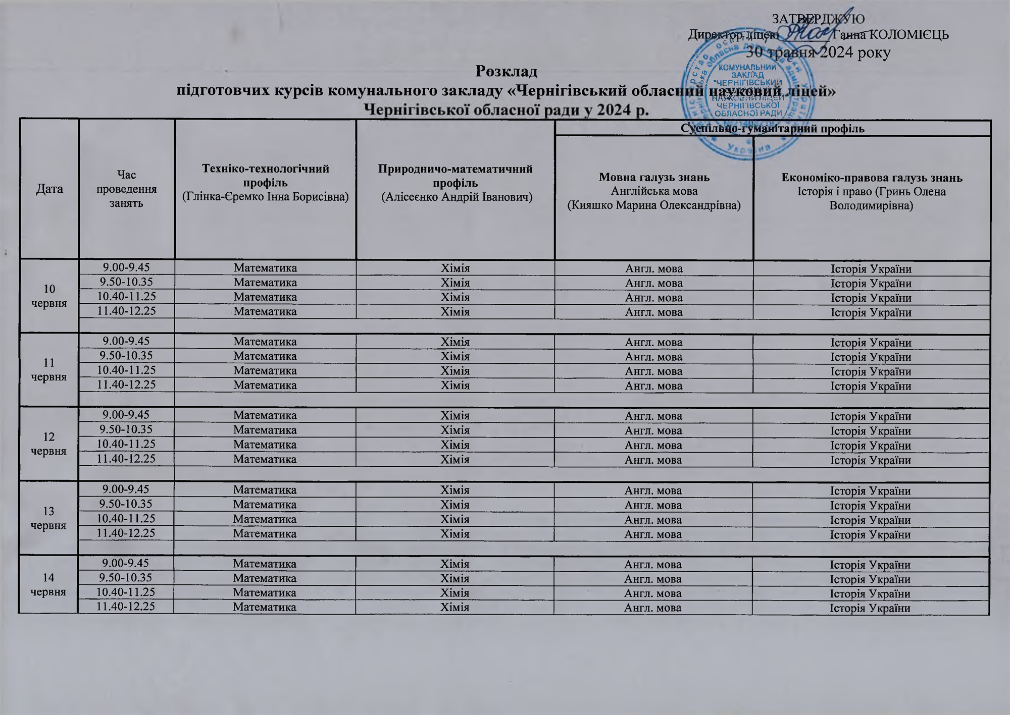 Розклад підготовчих курсів комунального закладу «Чернігівський обласний науковий ліцей» Чернігівської обласної ради у 2024 р.