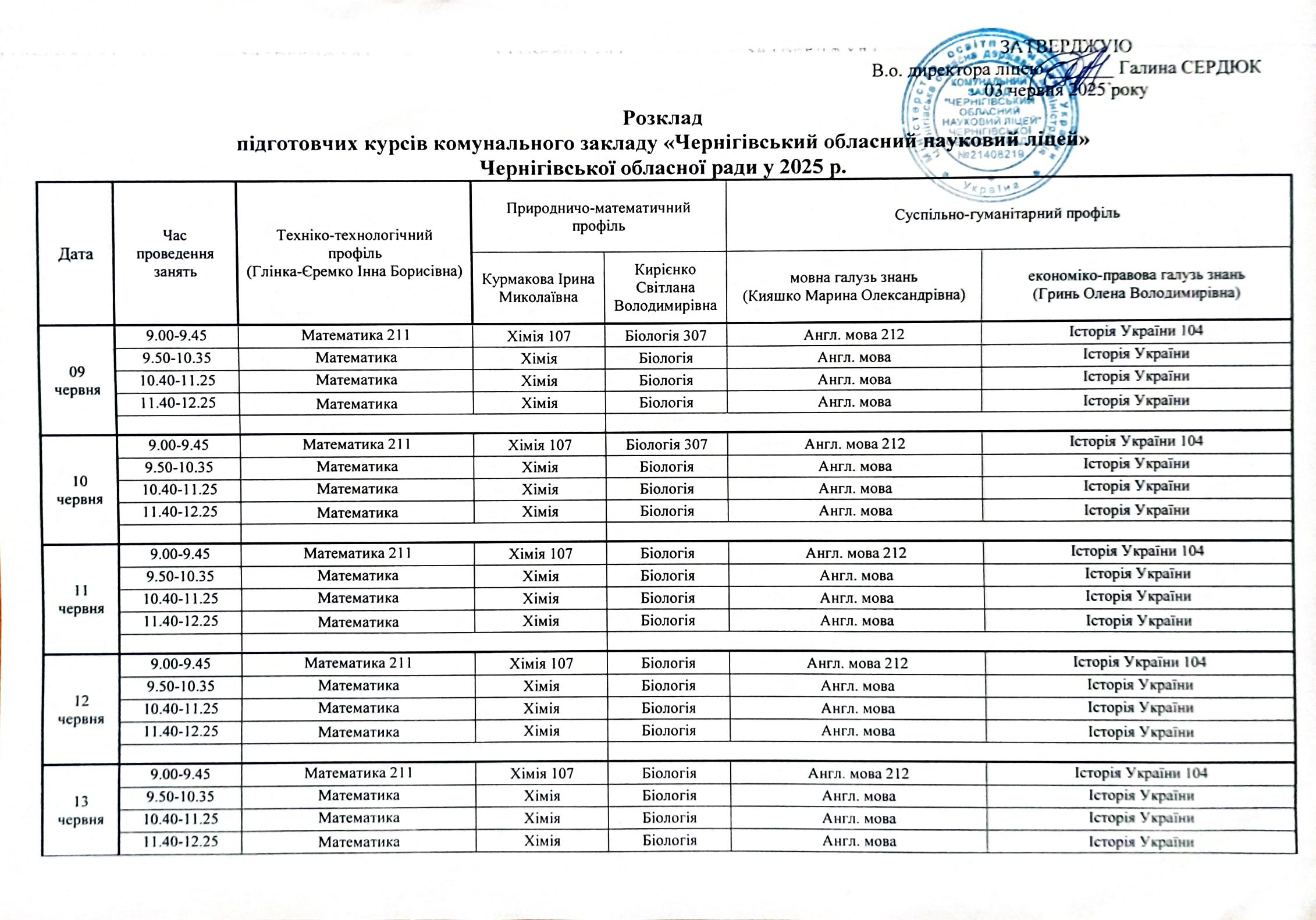 Розклад підготовчих курсів комунального закладу «Чернігівський обласний науковий ліцей» Чернігівської обласної ради у 2025 р.