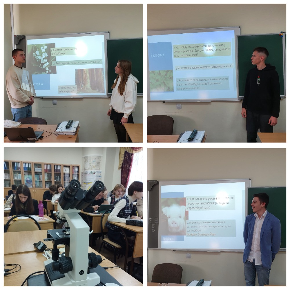 - Зіграли в пізнавальну вікторину "Наука хімія і повсякденне життя" і дізналися, до складу яких речей щоденного вжитку входять мелене скло і кістковий клей, хто зумовлює запах цибулі і який отруйний газ має лікувальні властивості (учитель Анджела Бутко).