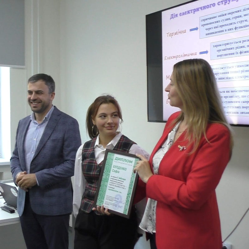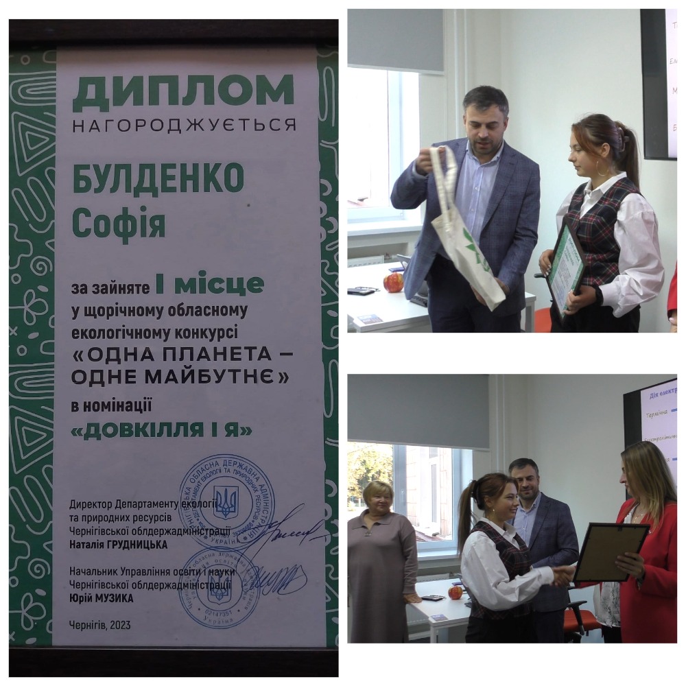 Диплом та цінні подарунки учениці вручили Юрій Музика, начальник Управління освіти і науки Чернігівської ОДА та Наталія Грудницька, директорка Департаменту екології та природних ресурсів Чернігівської ОДА.