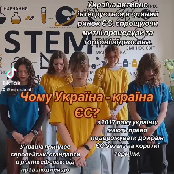 Євроклуб ліцею «Назустріч» за підтримки проєкту Представництва ЄС в Україні «Інформаційна підтримка мереж ЄС в Україні» впроваджує інформаційно-просвітницьку кампанію «Україна-ЄС: глобальні цілі-реальні дії!», щоб показати переваги європейської інтеграції для України та що означає цей процес для нас. Принагідно запрошуємо до акаунту Tik-Tok "ЄвроЧОНЛ", який запустили євроклубівці з метою популяризації ідей євроінтеграції: https://www.tiktok.com/@euro.chonl?_t=8qpes5Iz9iY&_r=1