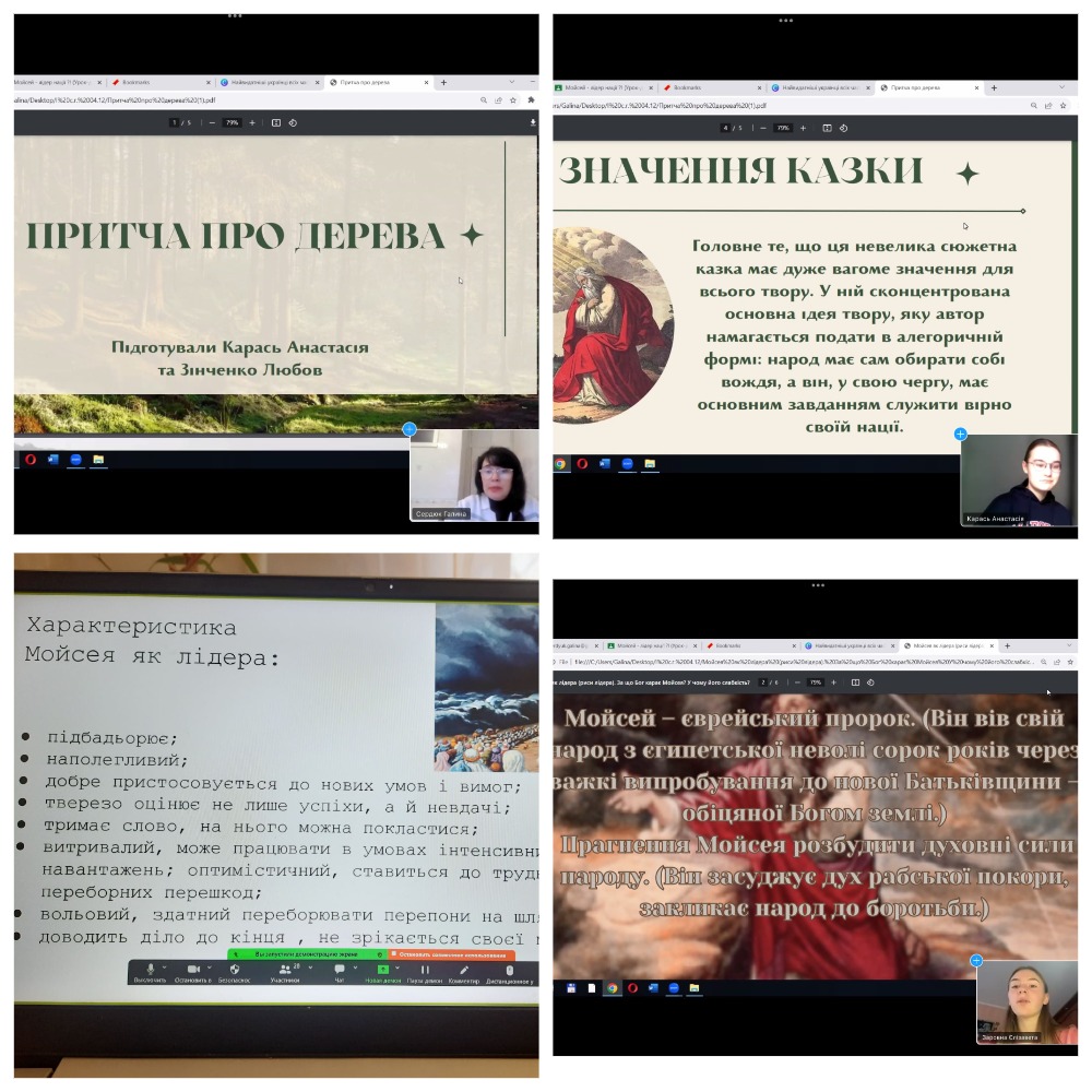 Що потрібно для досягнення успіху? Який зміст казки про Оріона, притчі про терен? Чому люди повірили лжевождям? За що Бог карає Мойсея? У чому слабкість лідера нації? Актуальність теми визначено з огляду на особливості суспільних змін. Про актуальність проблеми лідерства свідчать історії найвидатніших українців, про яких розповідали здобувачі освіти. Урок-дослідження – одна з ефективних форм організації освітнього процесу в ліцеї (на матеріалі поеми І. Франка «Мойсей»).