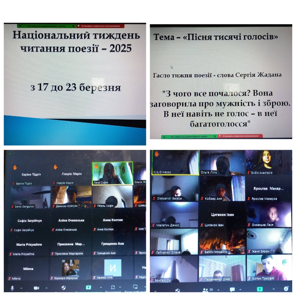Національний тиждень читання поезії дає можливість вслухатися у багатоголосся української поезії, у якій кожен може знайти слова, що відгукнуться в його серці. Саме тому до цієї акції долучилися 19 березня 2025 року ліцеїсти першого курсу техніко-технологічного й економіко-правового профілів, які обрали для прочитання ліричні твори Тараса Шевченка, Ліни Костенко, Василя Симоненка, Миколи Вінграновського, Василя Стуса, Лесі Українки, а також поезії, що стали реакцією українців на події російсько-української війни. За активну участь у Національному тижні читання поезії дякуємо Верхуші Варварі, Кириленку Назару, Прохоренку Назару, Лаврів Марії, Лапі Софії, Балабі Олександру, Кобзар Анні, Сікач Дарині, Кашпур Карині, Корсуну Денису.
