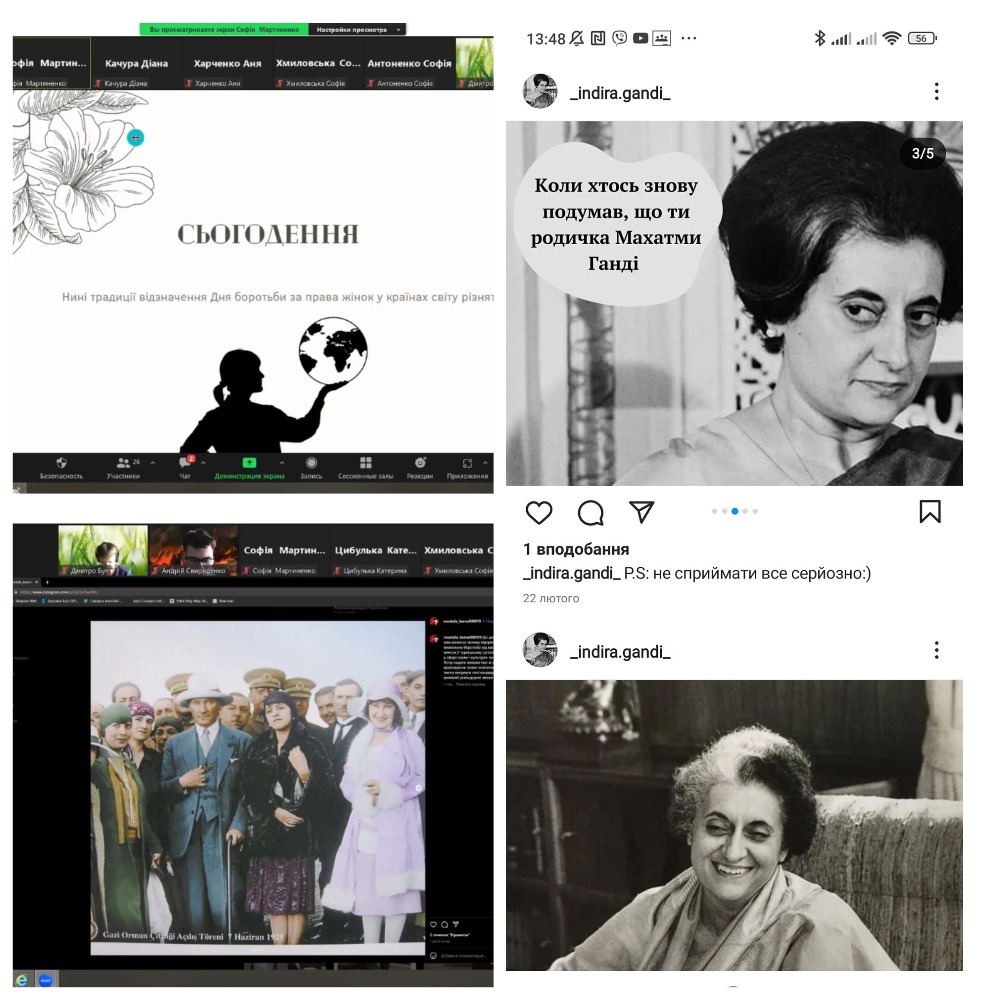 Під час уроків всесвітньої історії (учитель Олена Гринь Гринь Олена ) робочі групи презентували творчі роботи "Індира Ганді та Голда Меїр: жінки, які вибороли рівні права" (розробка інстаграм сторінки), "Боротьба жінок за свої права" (інформаційна трибуна) та інші.