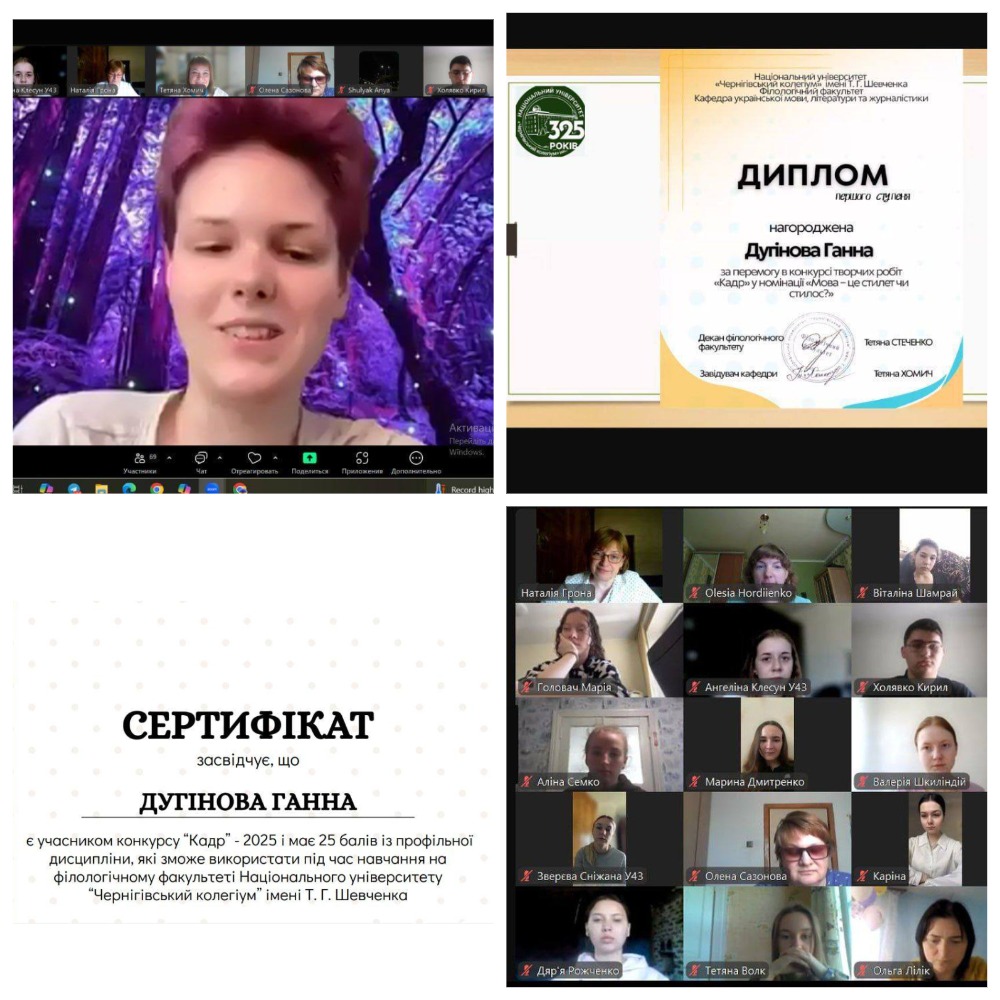 21 квітня 2025 року в Національний університет "Чернігівський колегіум" імені Т.Г. Шевченка відбулася церемонія нагородження переможців конкурсу «Кадр» у номінації «Мова − це стилет чи стилос?». Пишаємося, що учениці ліцею посіли призові місця:
