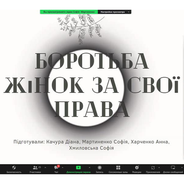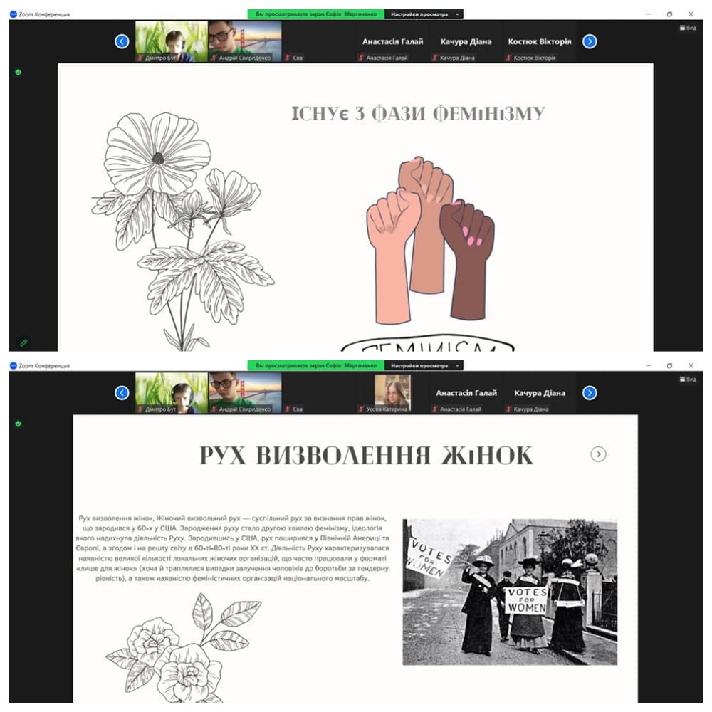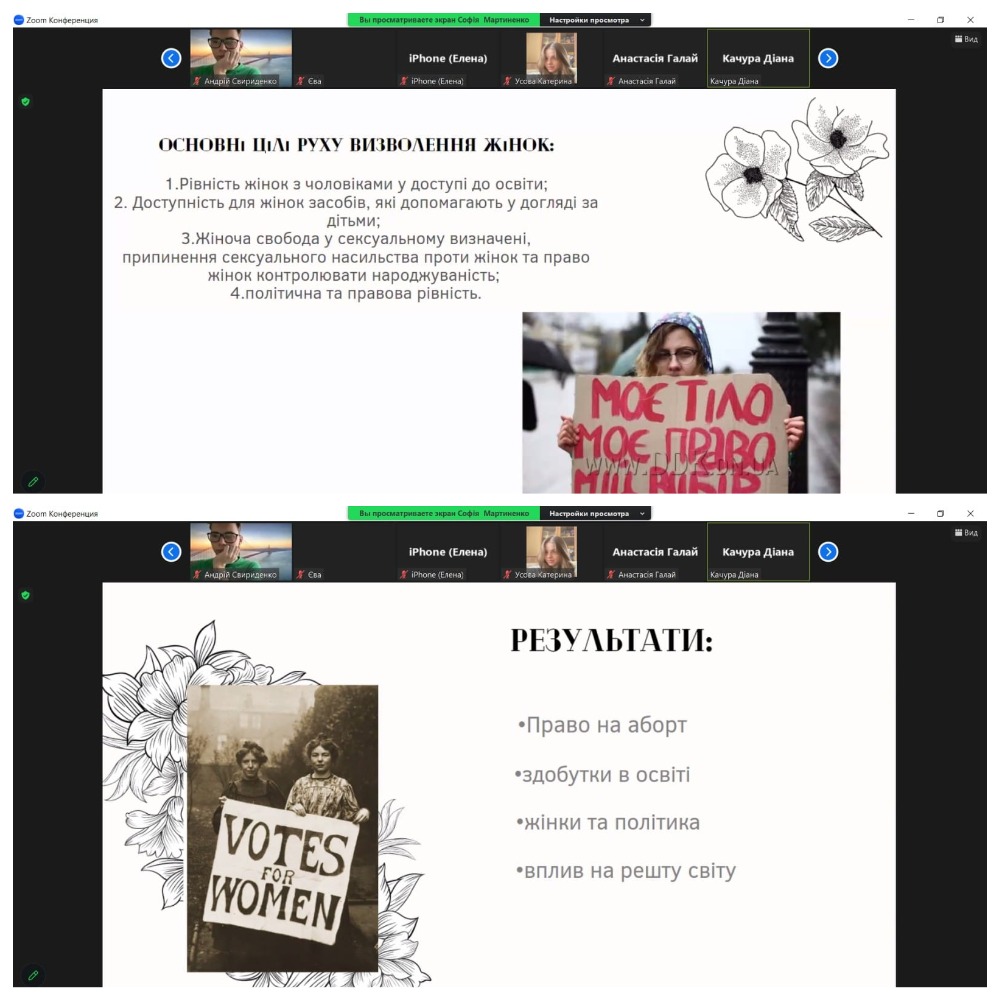 Під час уроків всесвітньої історії (учитель Олена Гринь Гринь Олена ) робочі групи презентували творчі роботи "Індира Ганді та Голда Меїр: жінки, які вибороли рівні права" (розробка інстаграм сторінки), "Боротьба жінок за свої права" (інформаційна трибуна) та інші.